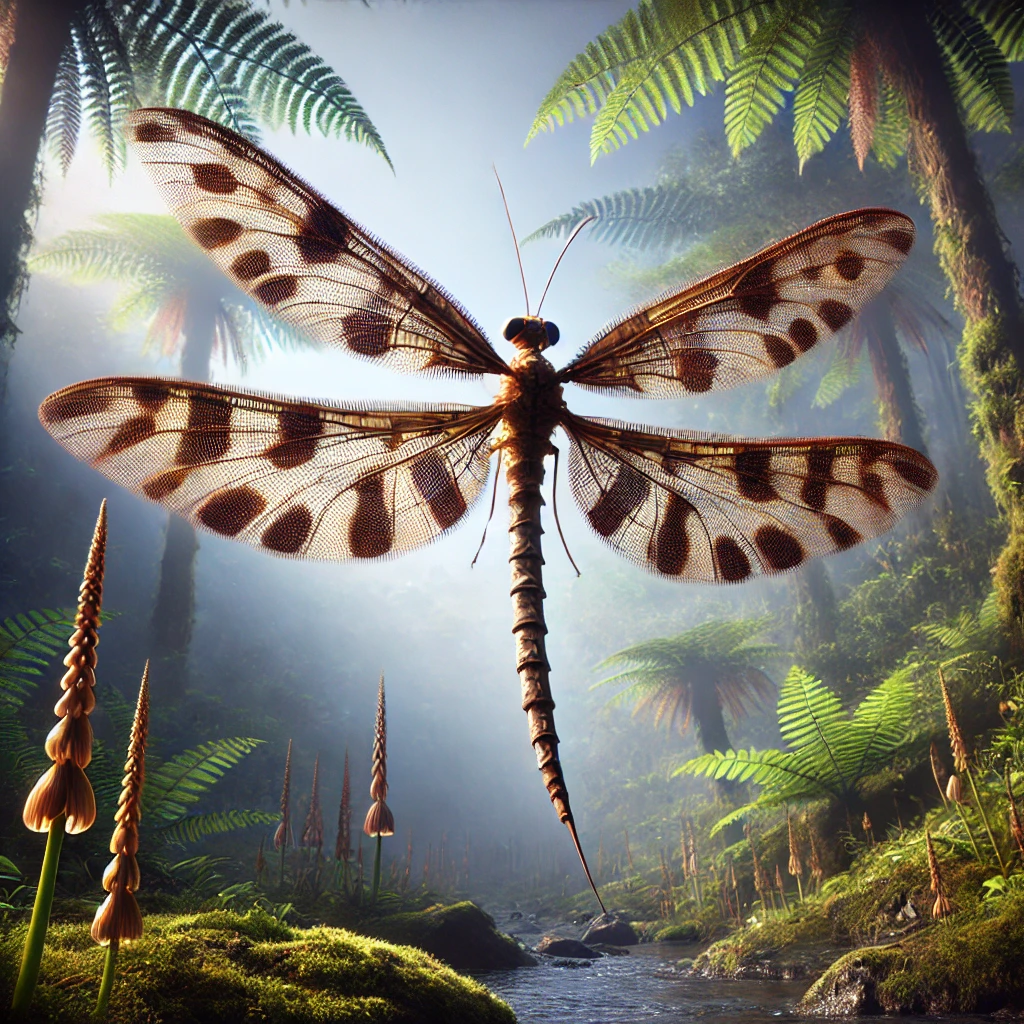 Meganeura, a giant dragonfly with a wingspan of over 70 cm, likely ruling the skies as a formidable predator.