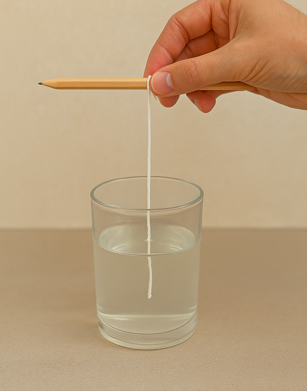 4. Tie the string to the pencil and place it across the top of the glass so the string hangs down without touching the sides or bottom.