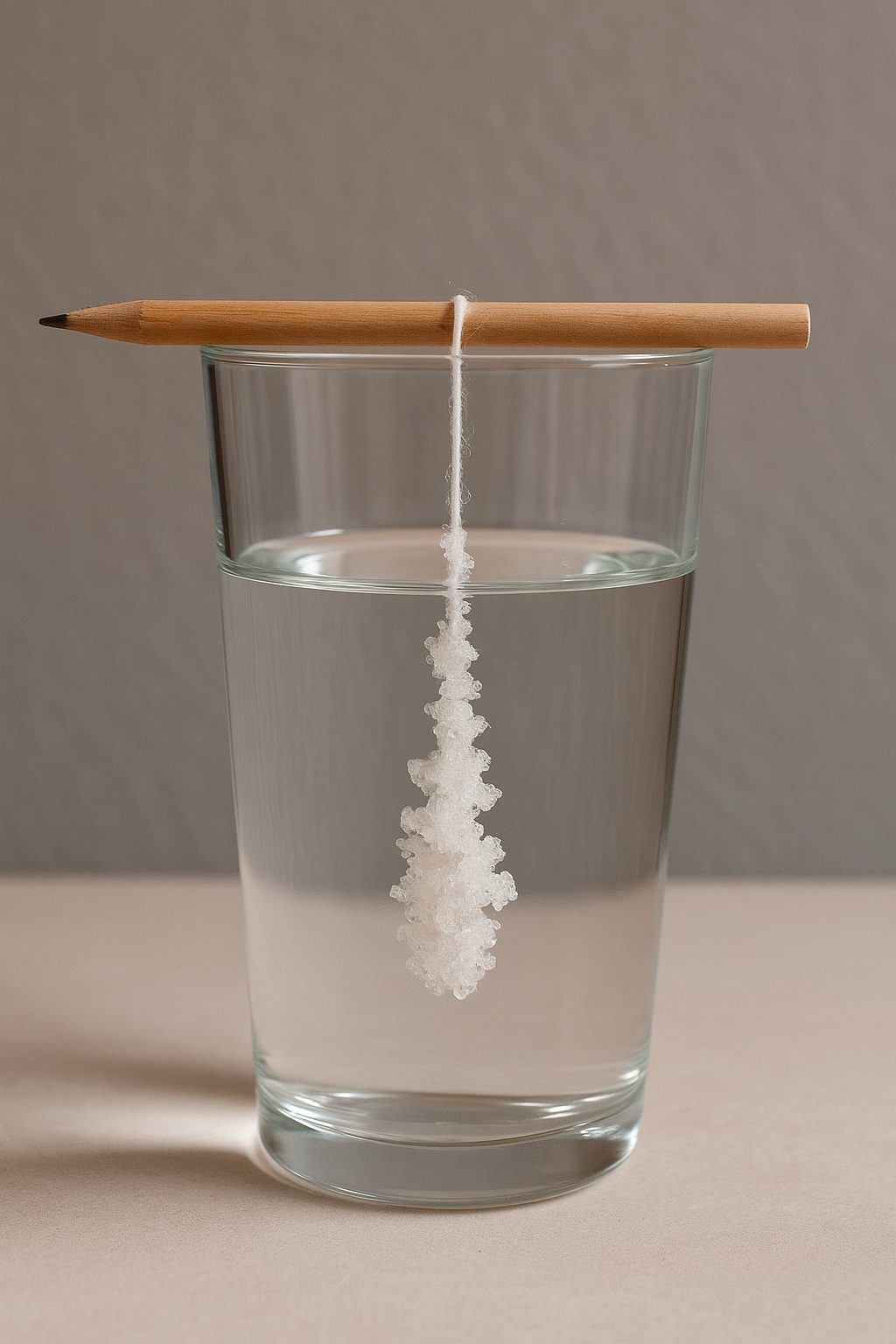 As the water evaporates, the excess salt begins to crystallize along the string, forming shiny, structured clusters. This is a real-life example of crystallization: a chemical process where molecules arrange themselves into an orderly and repeating pattern.